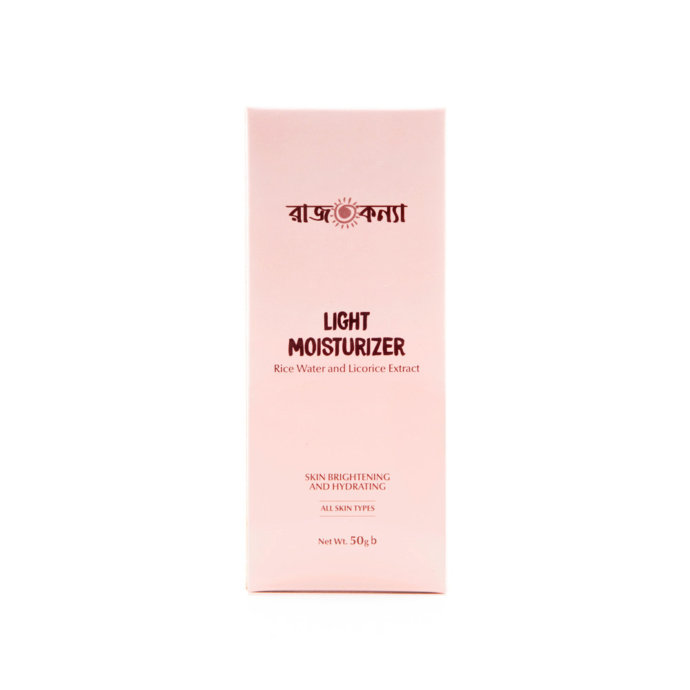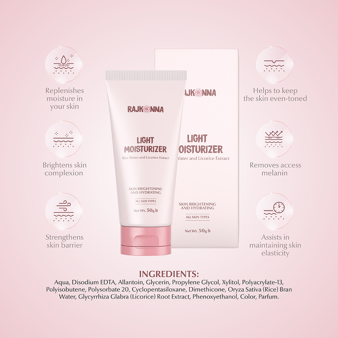 Rajkonna Light Moisturizer is a lightweight illuminating moisturizer infused with Rice Water and Licorice Extract that replenishes moisture in your skin. Rice water strengthens your skin barrier, keeps it even-toned, and boosts the production of elastin. Licorice Extract contains potent antioxidants and anti-inflammatory properties that remove excess melanin and give your skin a subtle glow.